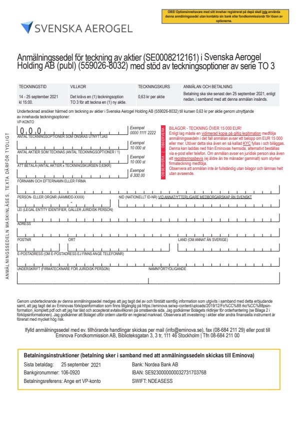 Anmälningssedel och instruktioner postas direkt till dig. Anmälningssedel finns även tillgänglig på Eminova Fondkommission och Svenska Aerogel respektive hemsidor. Betalning sker enligt instruktioner på anmälningssedeln. Både anmälningssedel och betalning ska vara Eminova Fondkommission tillhanda senast enligt det datum som anges på anmälningssedeln.
